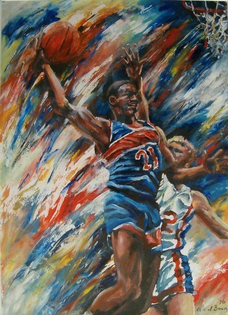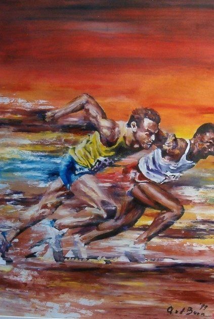 Jarenlang heb ik mijn sportschilderijen gemaakt met behulp van de Gom-Batik techniek. Waarbij een verf op oliebasis (drukinkt ) op karton wordt aangebracht. Arabische Gom functioneert dan als afdekmiddel, zoals was bij het Indonesische batik. Ooit heb ik hiermee kennisgemaakt in mijn studieperiode , ook binnen het thema SPORT .Vanwege het verkoopsucces van deze eerste creaties en de vraag om meer ben ik deze weg verder ingeslagen.
